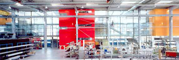 Centre of the plant is the production hall. The longer northern side of the building carries a three-tier "back-pack" which houses the administration areas. "Climatic gardens", unheated buffer zones, divide them into different smaller two-level offices. Large interior glass walls make them transparent towards the production hall.